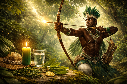 A figura de Oxóssi está intrinsecamente ligada à caça, simbolizando a mira certeira, a paciência e a capacidade de planejamento para alcançar seus objetivos. Essa sabedoria ancestral é frequentemente invocada em rituais que visam atrair prosperidade financeira, promoções e a realização de metas de carreira.